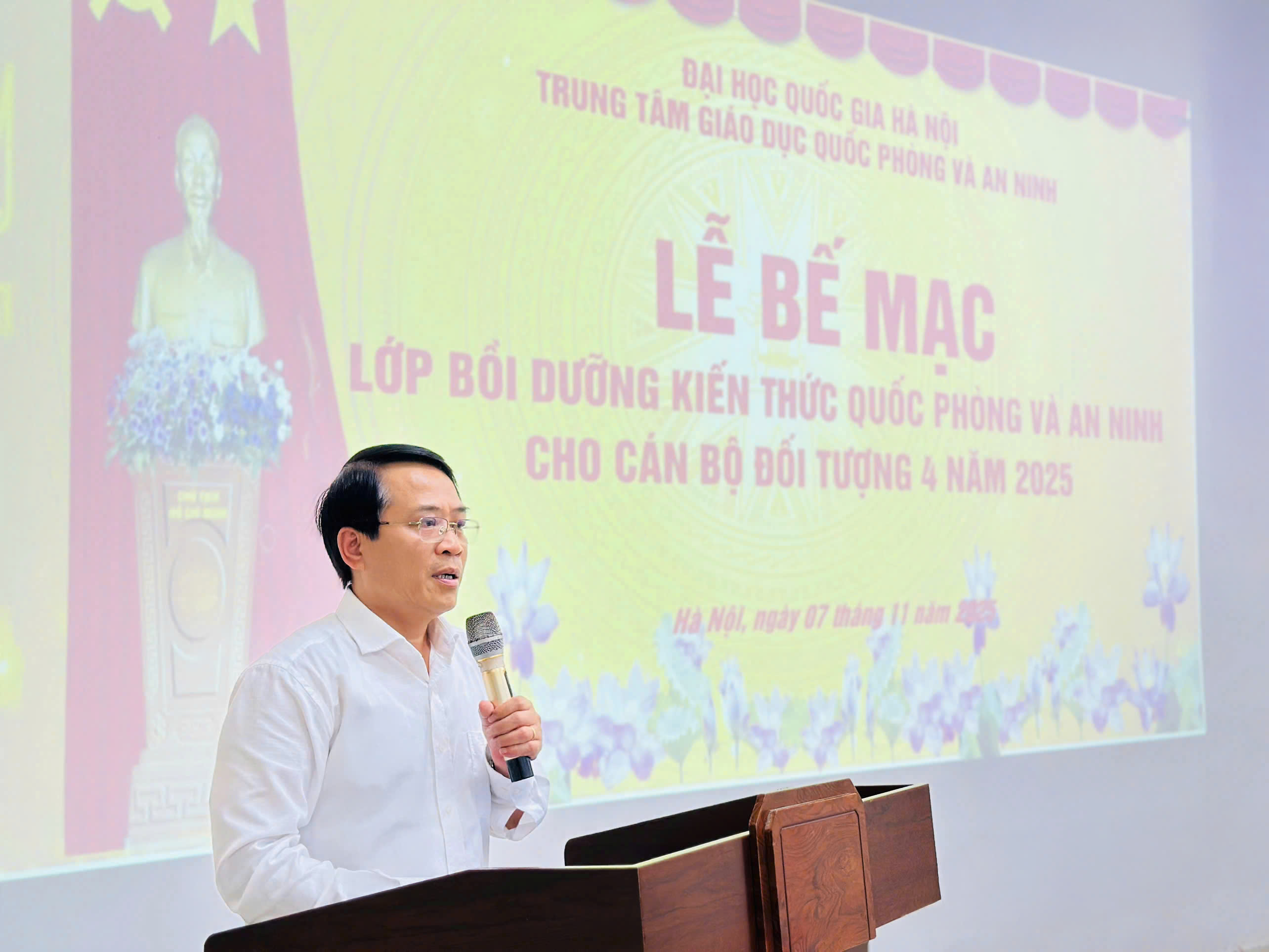 Theo Kế hoạch số 1705/KH-QPAN ngày 23/10/2025, khóa bồi dưỡng diễn ra từ ngày 03 đến ngày 08 tháng 11 năm 2025 tại Trung tâm GDQP&AN, ĐHQGHN. Toàn bộ học viên ăn ở tập trung 24/24 giờ, tham gia đầy đủ các nội dung học tập, thảo luận, viết thu hoạch theo quy định. Chương trình được thiết kế khoa học, kết hợp giữa học lý thuyết và trao đổi thực tiễn, chú trọng phát triển tư duy phân tích, khả năng vận dụng và gắn kiến thức quốc phòng và an ninh với công tác chuyên môn của từng cá nhân.